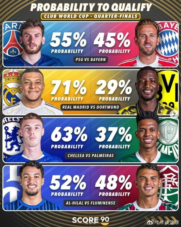 Score90对世俱杯8强战结果进行了预测,巴黎对阵拜仁略微占优,皇马胜多特概率超过7成,切尔西淘汰帕尔梅拉斯概率超6成,利雅得新月有超过半数的可能击败弗鲁米嫩塞。